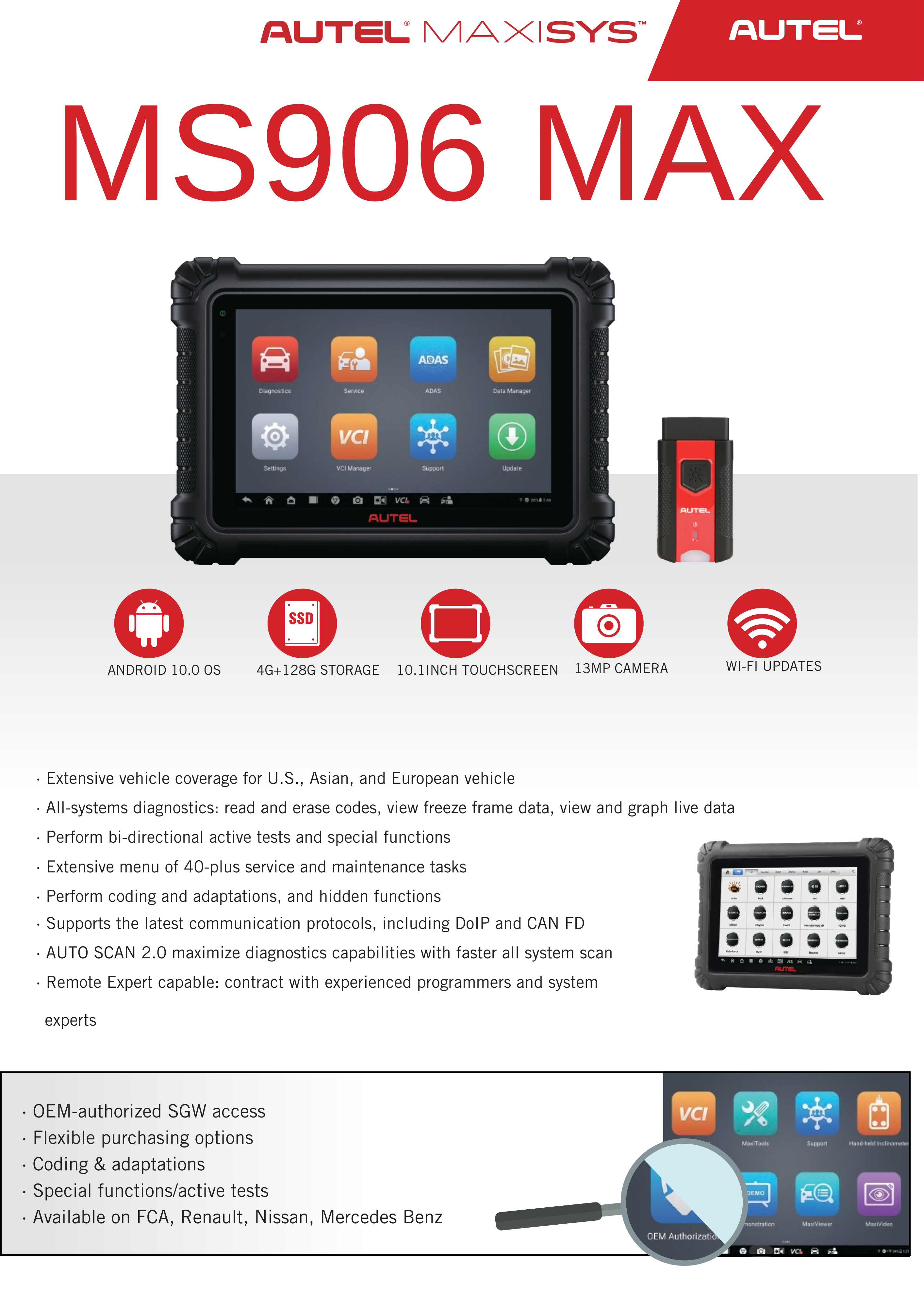 The Autel MaxiSys MS906 Max is a powerful professional automotive diagnostic scanner designed to provide comprehensive diagnostics for U.S., Asian, and European vehicles. Built with a 10.1-inch touchscreen, Android 10 operating system, and 4GB RAM with 128GB SSD storage, the device offers fast performance, large storage capacity, and an intuitive interface for technicians and repair shops.