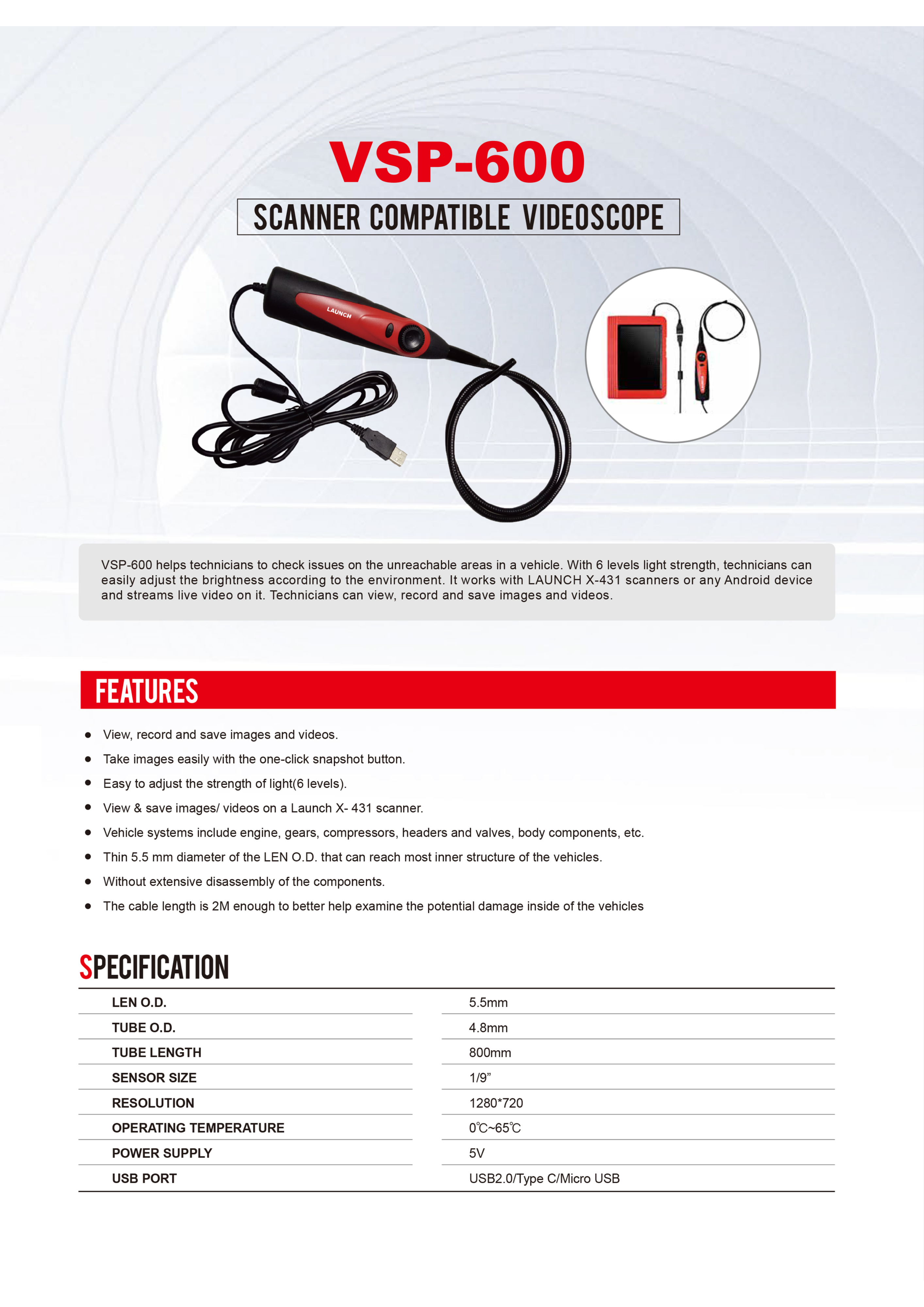 Lens O.D.: 5.5 mm Tube O.D.: 4.8 mm Tube Length: 800 mm Sensor Size: 1/9" Resolution: 1280 × 720 Operating Temperature: 0°C – 65°C Power Supply: 5V USB Port: USB 2.0 / Type-C / Micro USB Key Features...