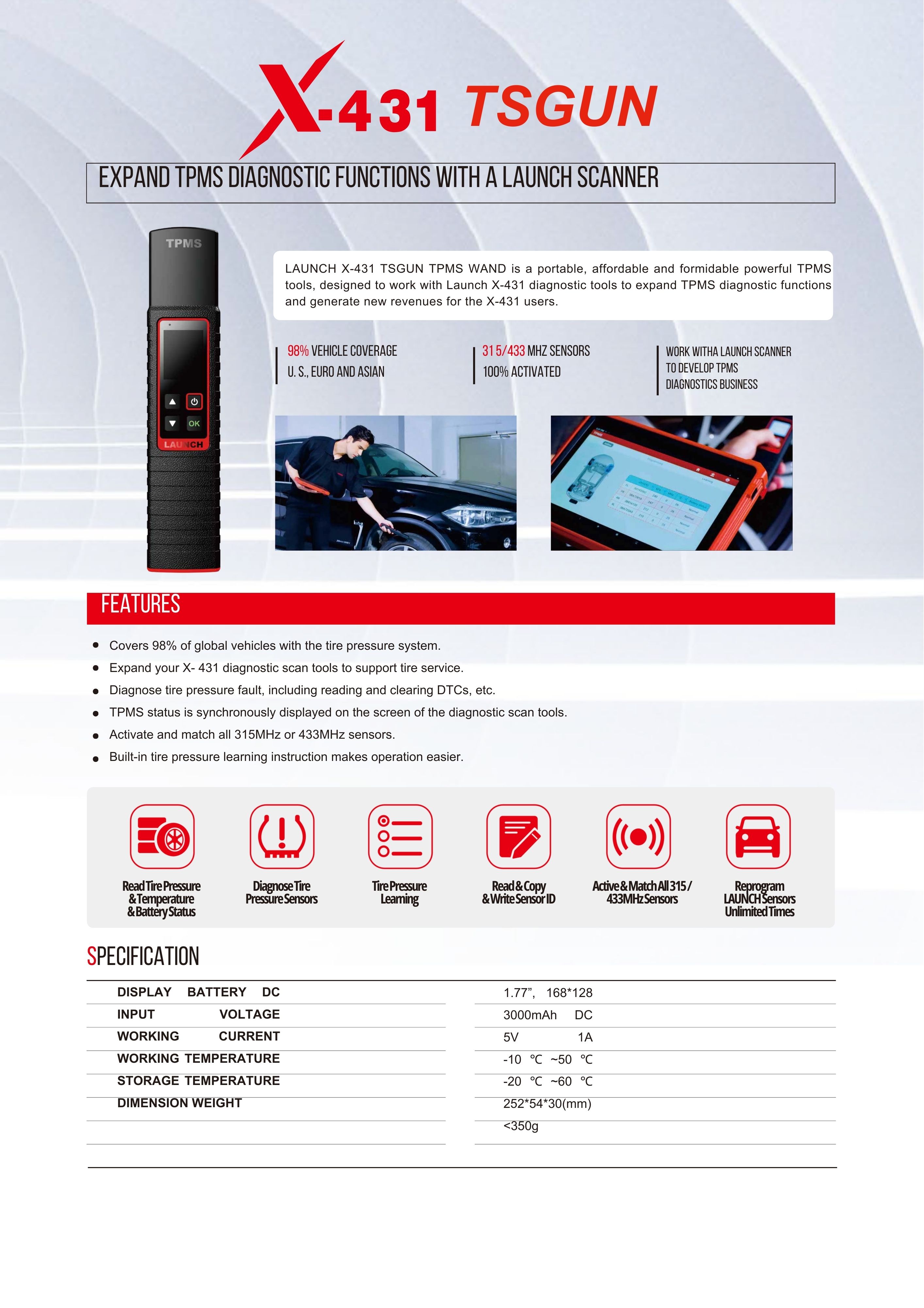 The Launch X-431 TSGUN TPMS Wand is a portable TPMS tool designed to work with Launch X-431 diagnostic scanners to expand tire pressure monitoring system diagnostics and tire service capabilities. It allows...
