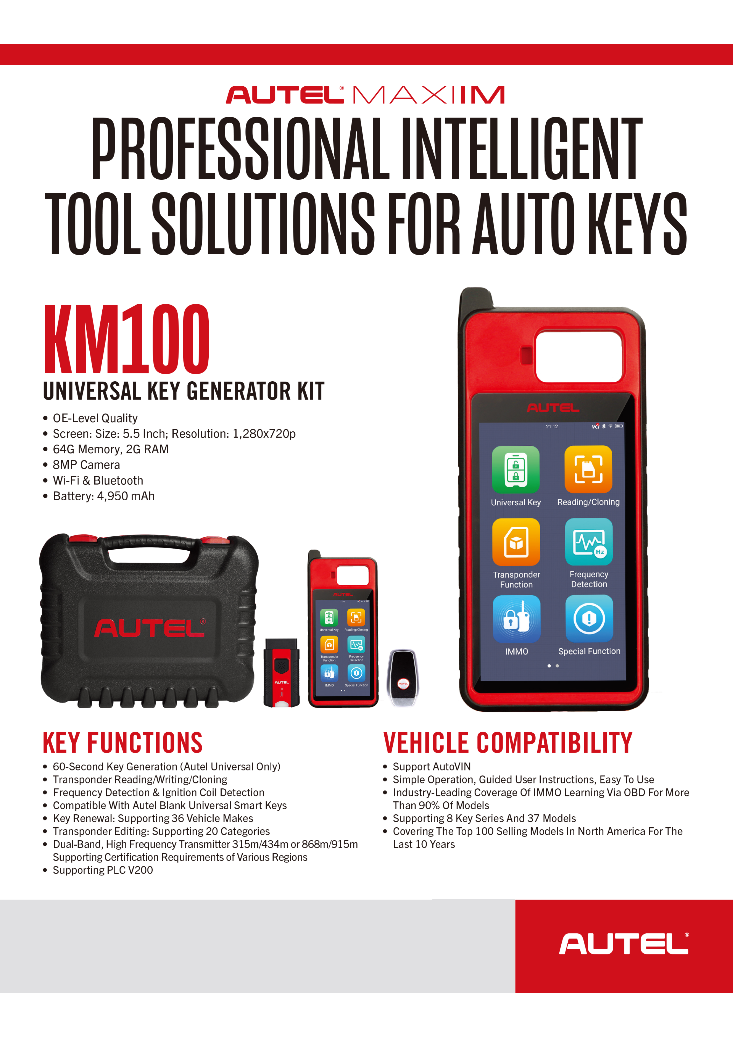 The Autel MaxiIM KM100 is a professional intelligent tool designed for automotive key programming and key generation. The KM100 Universal Key Generator Kit provides OE-level quality and features a 5.5-inch touchscreen display with 1280×720 resolution, 64GB memory, 2GB RAM, an 8MP camera, Wi-Fi and Bluetooth connectivity, and a 4,950mAh battery.