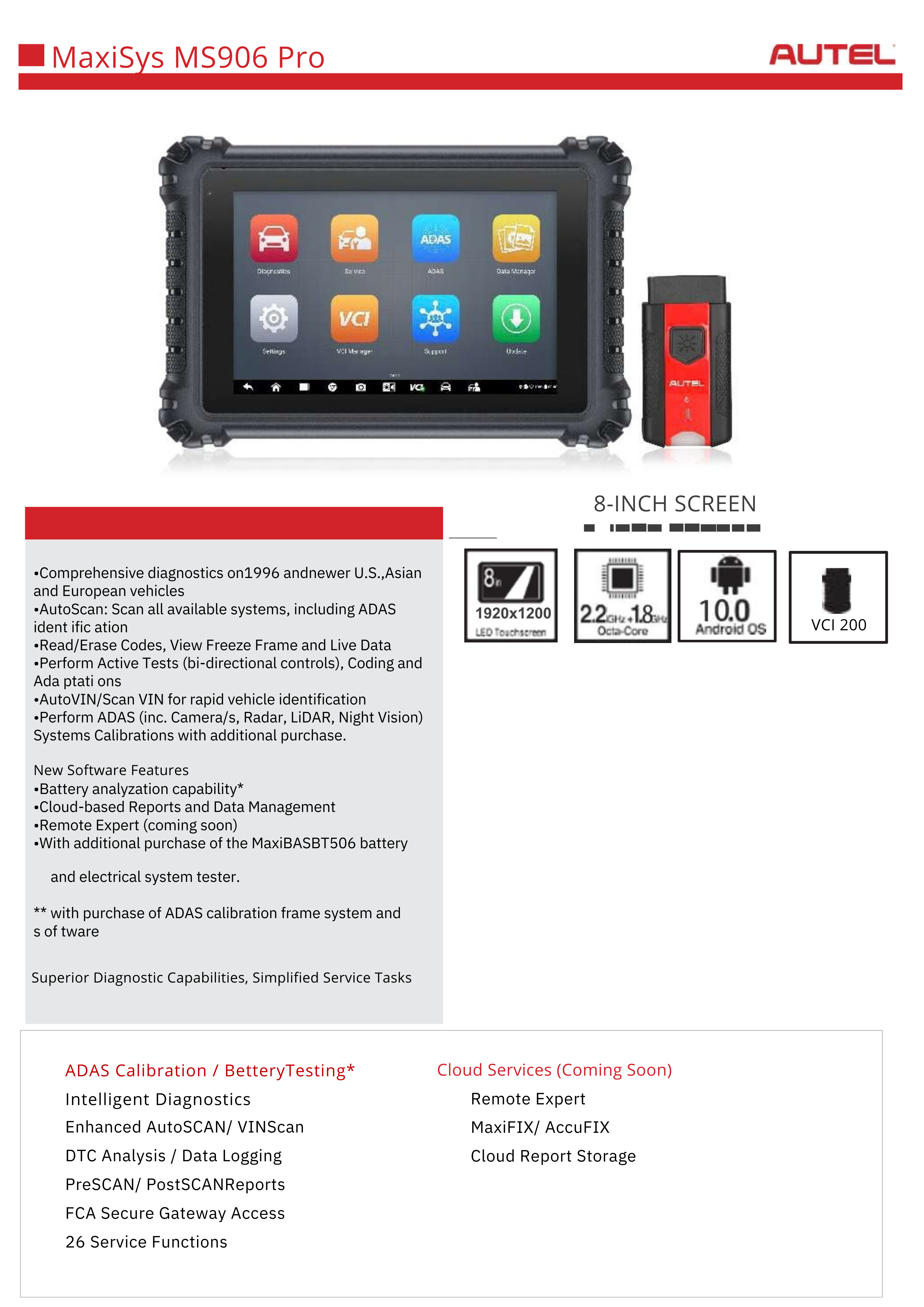 The Autel MaxiSys MS906 Pro is a powerful professional automotive diagnostic tablet designed for comprehensive vehicle diagnostics on 1996 and newer U.S., Asian, and European vehicles. Featuring an 8-inch 1920×1200 LED touchscreen, an Octa-core processor (2.2 GHz + 1.8 GHz), and running on Android 10, the MS906 Pro delivers fast performance, advanced diagnostics, and a user-friendly interface for professional technicians and workshops.