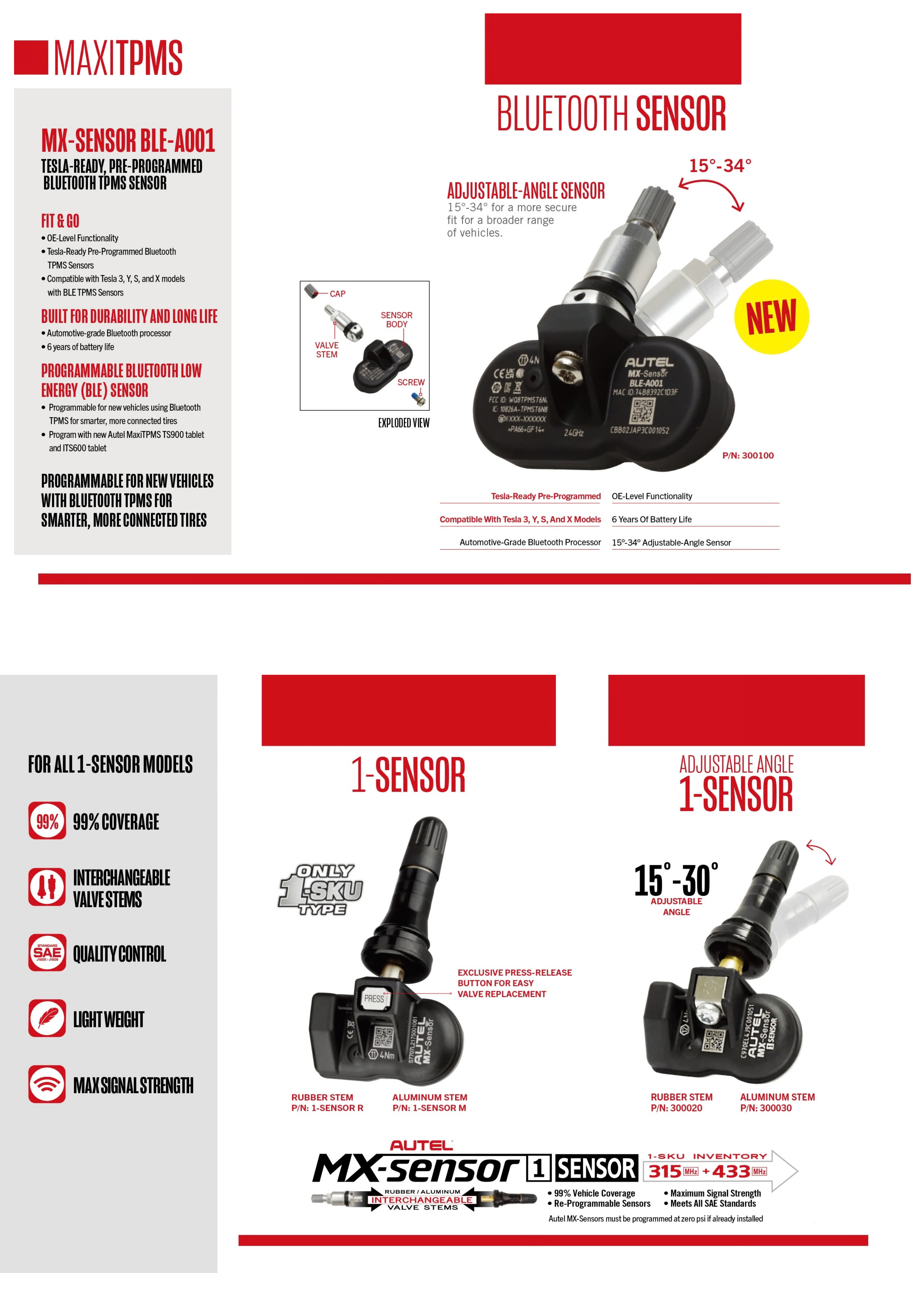 The sensor features interchangeable valve stems, allowing quick replacement when needed, and includes a press-release button for easier valve replacement. Built to meet SAE quality standards, the sensor provides maximum signal strength and dependable performance for TPMS systems.